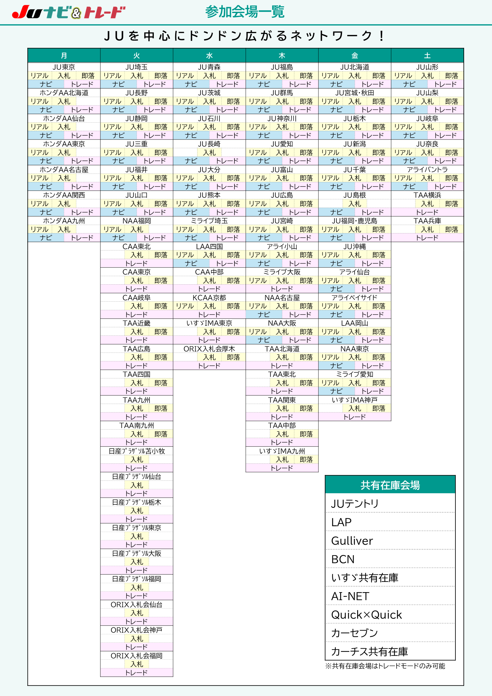 会場ごとに、利用可能なツール「リアル」「入札」「即落」、選択可能な取引モード「ナビ」「トレード」を表示しております。 |